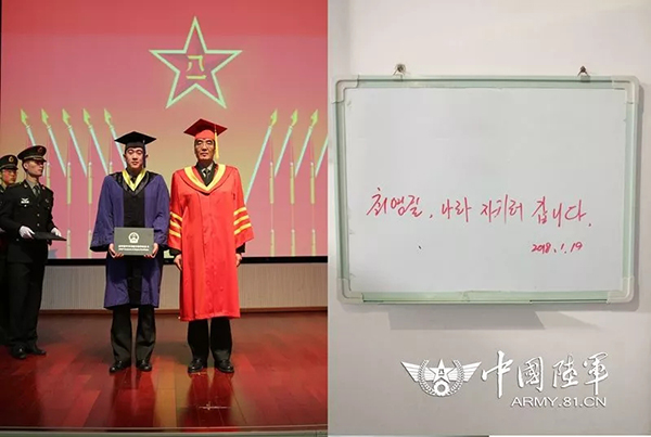朝鲜族学生崔永杰来自吉林珲春,他抉择去西部某支特战劲旅中历练本人。他人问他为什么如许抉择,他说本人在西南亚边疆长年夜,扛起钢枪为故国站岗无穷荣光。行将归队时,他饱含着对矢志强军的动摇信心,在队内的布告栏上用朝鲜语写下:崔永杰,去捍卫故国了!