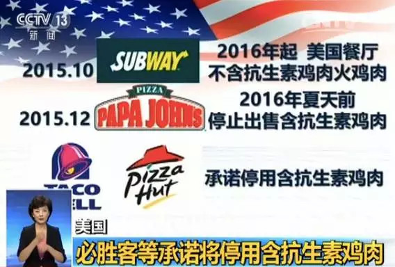 在 美国,良多快餐巨子连续参加到停用抗生素的行列中。客岁10月,赛百味发布从往年开端在其美国餐厅供给不含抗生素的鸡肉跟火鸡肉。客岁12月,棒约翰发布 在往年炎天前结束出卖应用过抗生素的鸡肉。百盛团体旗下的两个快餐品牌塔可钟跟必胜客也已许诺将2017年作为停用含抗生素鸡肉的最前期限。