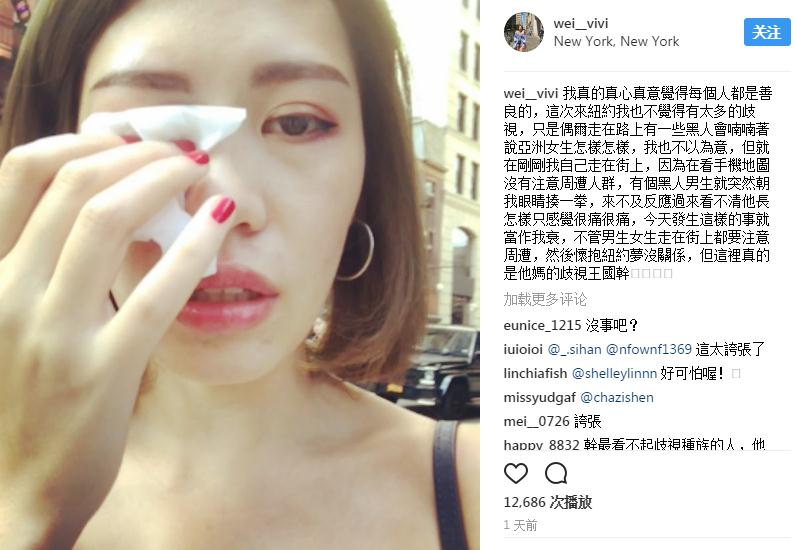 [举世网综合报道 记者 赵衍龙]台湾一名男子到美国纽约去游览,走在路上的时间却无故被打。她25日在Instagram上传一段视频跟被打之后眼睛肿胀的图片,称本人被一名黑人女子无故揍了一拳,招致她右眼瘀青红肿,疑似受到种族轻视,在表白过恼怒之后表现,“这里真的是他X的轻视王国”。台湾东森消息云8月26日称,该男子系来自台湾的一名24岁郑姓男子。