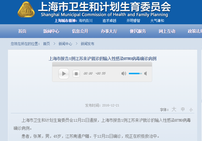 据上海卫计委网站新闻,上海市卫生跟打算生养委员会12月21日转达,上海市讲演1例江苏来沪就诊的输入性沾染H7N9病毒确诊病例。