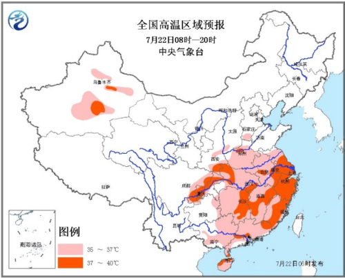 中新网7月22日电 据中心景象台新闻,中心景象台7月22日06时持续宣布低温黄色预警:估计22日白昼,江南、华南、江淮、江汉、四川盆地中东部、黄淮西部跟南部、陕东北部等地有35~38℃的低温气象,此中,浙江、上海、江苏南部、安徽西北部、福建北部、重庆、湖北西部等地的部分地域最高气温可达39~40℃。