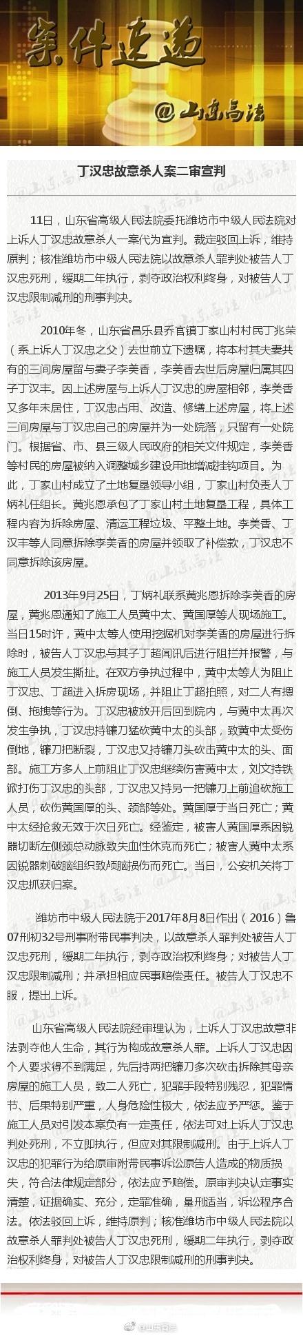 中新网1月11日电 据山东省高等国民法院官方微博新闻,11日,山东省高等国民法院委托潍坊市中级国民法院对上诉人丁汉忠成心杀人一案代为宣判。裁定采纳上诉,保持原判;批准潍坊市中级国民法院以成心杀人罪判处原告人丁汉忠极刑,脱期二年履行,褫夺政治权力毕生,对原告人丁汉忠限度弛刑的刑事裁决。