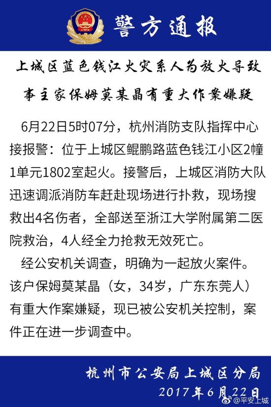 中新网杭州6月22日电(见习记者 梅芳燕)22日上午,杭州上城官方微博宣布新闻,明天清晨5时07分,杭州市上城区鲲鹏路蓝色钱江公寓2幢1单位1802产生火情。经由消防尽力挽救,5时54分,现场火势失掉把持;6时48分,现场火警被毁灭。现场挽救出的4人经挽救有效殒命。