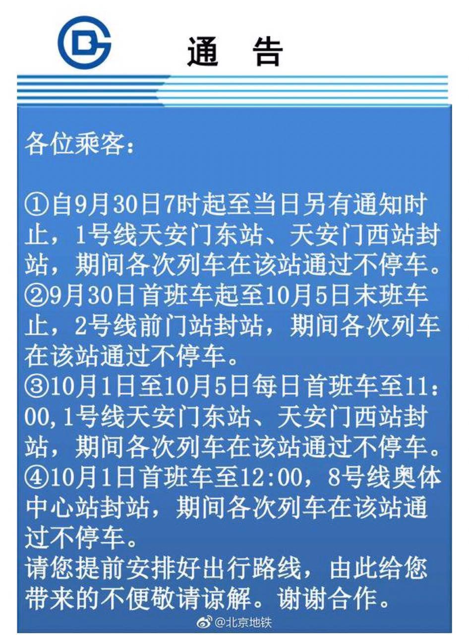 ①自9月30日7时起至当日尚有告诉时止,1号线天安门东站、天安门西站封站,时期各次列车在该站经由过程不绝车。