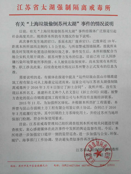《情形阐明》夸大:须要阐明的是,有媒体在报道中说起“这些渣滓由昆山市锦鹿建造工程无限公司从上海嘉定输送而来,这家公司与江苏省太湖强迫隔 离戒毒所于2016年3月8日签署了卸土条约”,我所申明,不发明以本所名义、基建科名义跟团体名义签署《卸土条约》成绩。被警方查处的昆山市锦鹿建造 工程无限公司与本所不直接经济接洽。2015年11月,为增强所区绿化,并依据本所西扩工程须要,本所曾与昆山市强顺土方工程无限公司签署供土协定,合 同已于2016年3月尾实行结束。此中回填的土方系绿化用土,并经由姑苏外地环保部分检测,合乎环保应用请求。