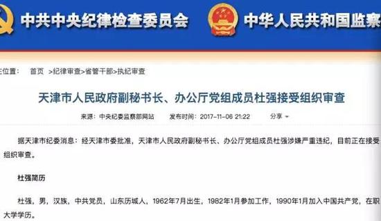 据天津市纪委新闻:经天津市委同意,天津市国民当局副秘书长、办公厅党构成员杜强涉嫌重大违纪,现在正在接收构造检察。