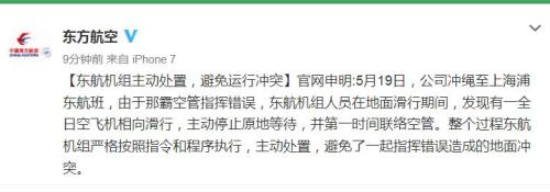 中新网5月21日电 西方航空官方微博本日宣布申明称,19日,西方航空冲绳至上海浦东航班,因为那霸空管批示过错,东航机组职员在空中滑行时期,发明有一整日空飞机相向滑行,东航机组职员自动结束原地等候,并第一时光联系空管。