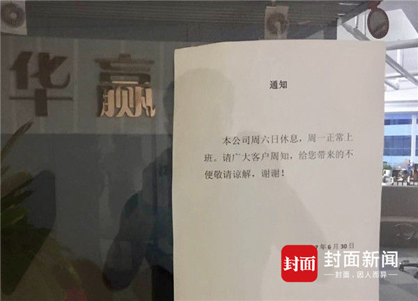封面消息记者留神到,贴在华赢凯来办公室玻璃门杀鹉一张告诉称,“本公司周六日苏息,周一畸形下班”。