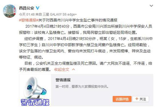 据警方转达,2017年4月4日晚21时40分,西昌市公安局川兴派出所接到川兴中学保安职员报警称:该校有人坠楼身亡。接警后,平易近警即时出警赶赴现场处理。