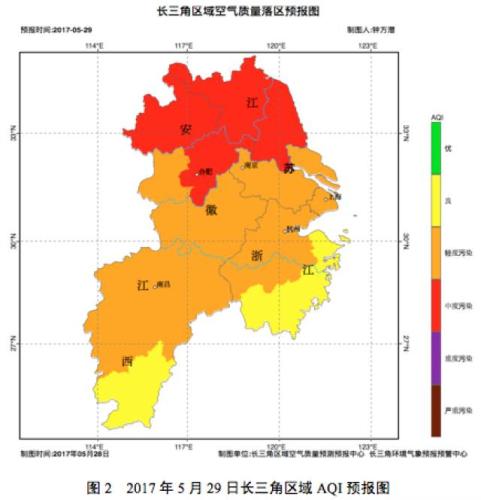 ● 5月29日,长三角位于高压后部,中北部轻度到中度传染,重要传染物O3,其他地域以良为主。