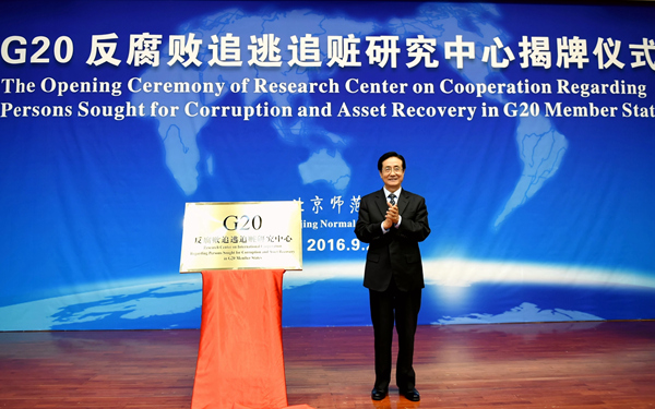9月23日,二十国团体反腐朽追逃追赃研讨核心在北京设破。中共中心书记处书记、中心纪委副书记赵洪祝缺席研讨核心揭牌典礼。(中心纪委监察部网站 徐梦龙 摄)